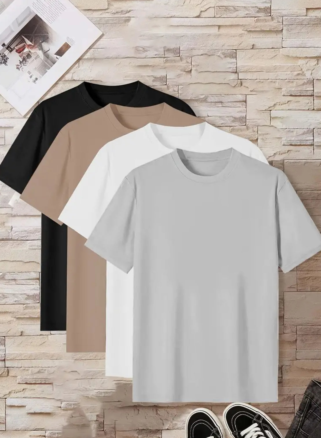 Refresh your rotation with these 4pcs Men’s Casual Crew Neck T-Shirts, designed in modern solid colors with a smooth polyester fabric that feels clean and lightweight on the skin. Their slight stretch and all-season versatility ensure comfort and style whether layering in cooler months or wearing solo on warm days. Machine washable and easy to maintain, these tees are essential staples for a sleek, effortless daily look.