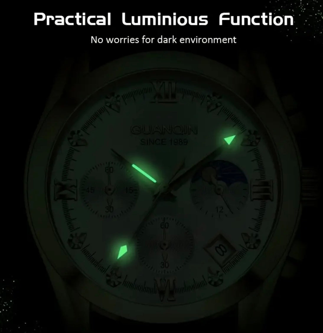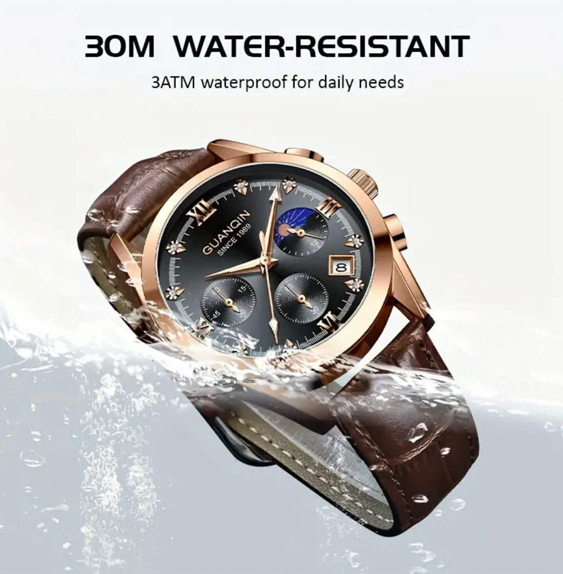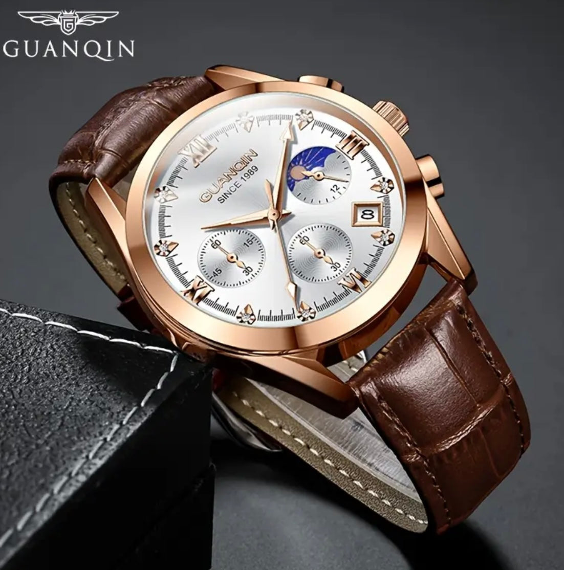 The “GUANQIN” Leather Watch combines bold functionality with refined aesthetics. Featuring a robust stainless steel case and bracelet, these watches are available in sleek black or sophisticated silver-white dials. Ideal for professionals and connoisseurs, the chronograph functions add a sporty edge to an otherwise classic design.