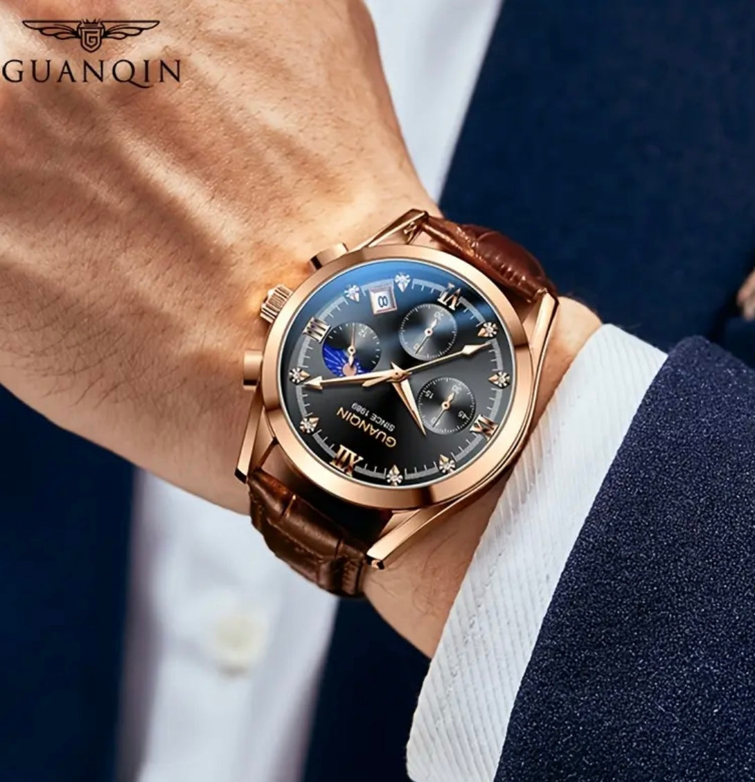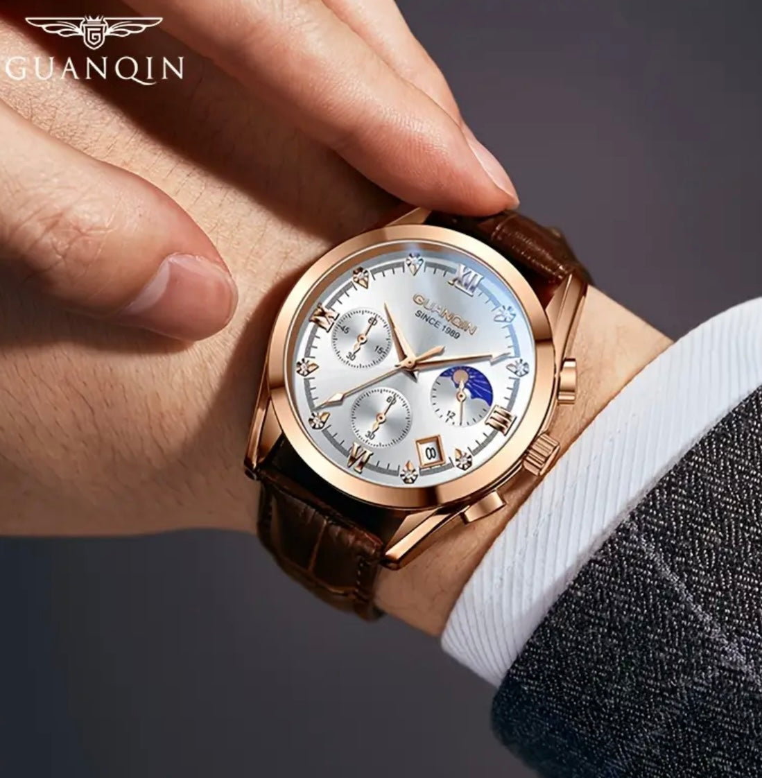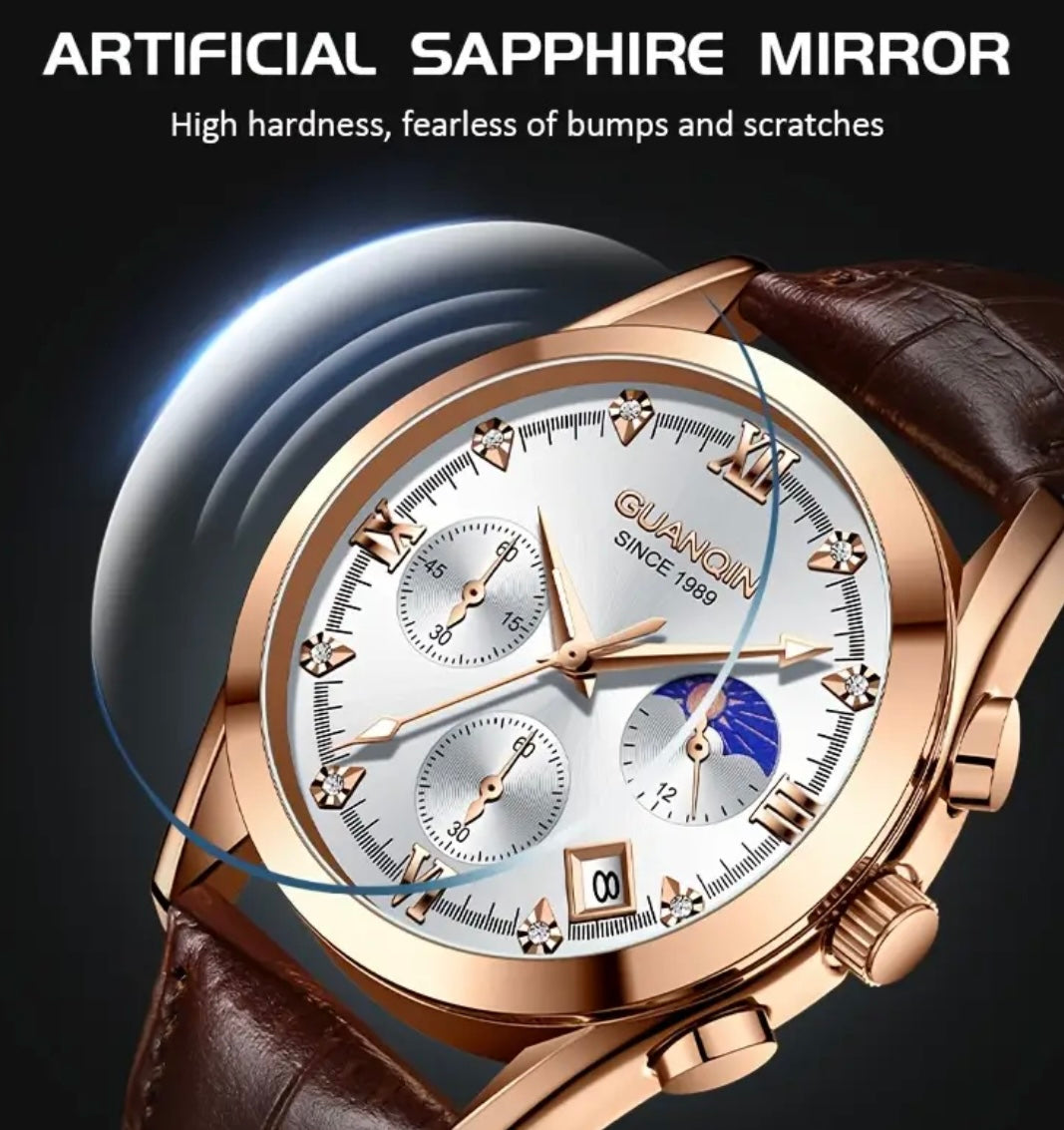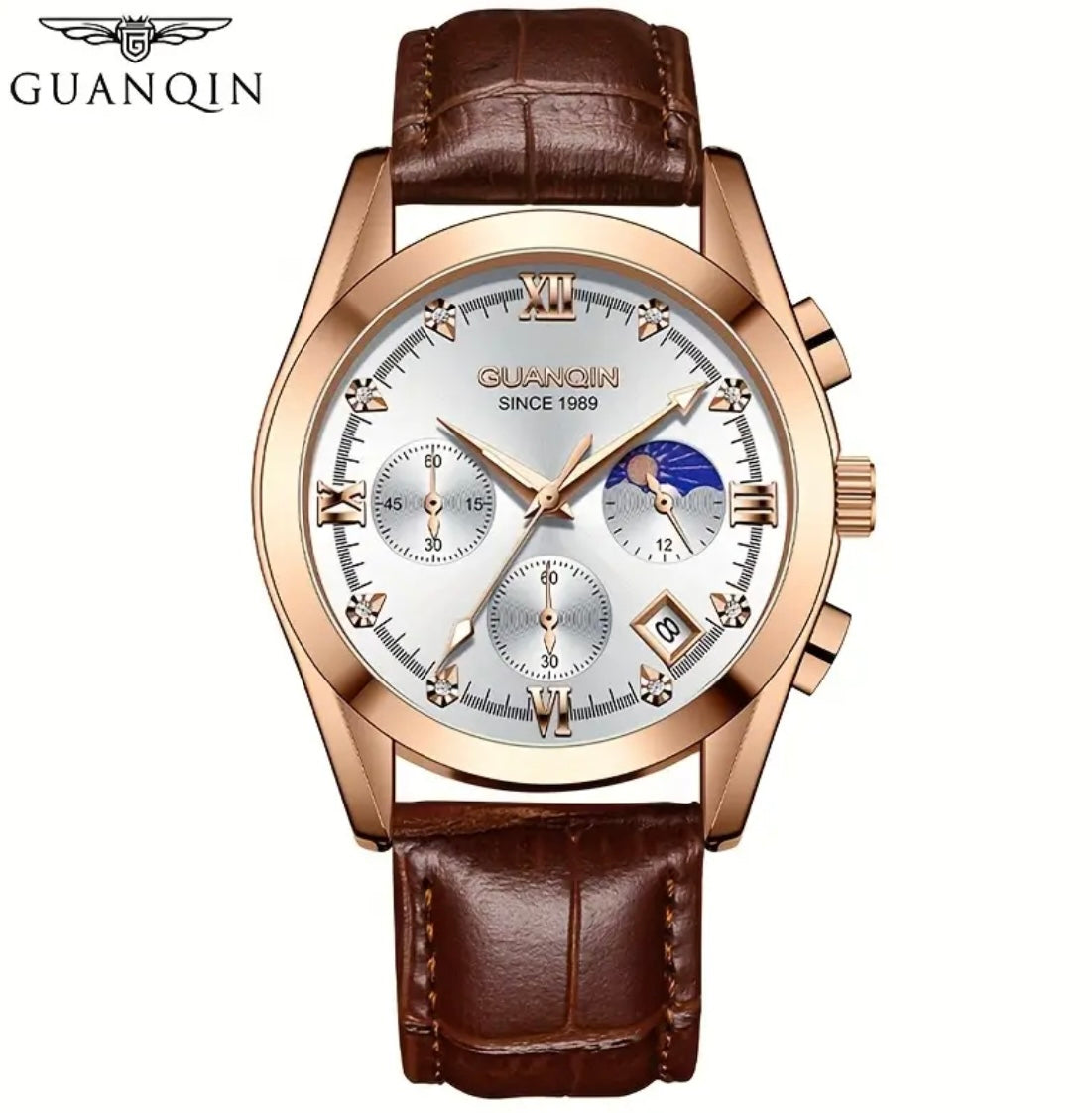 The “GUANQIN” Leather Watch combines bold functionality with refined aesthetics. Featuring a robust stainless steel case and bracelet, these watches are available in sleek black or sophisticated silver-white dials. Ideal for professionals and connoisseurs, the chronograph functions add a sporty edge to an otherwise classic design.