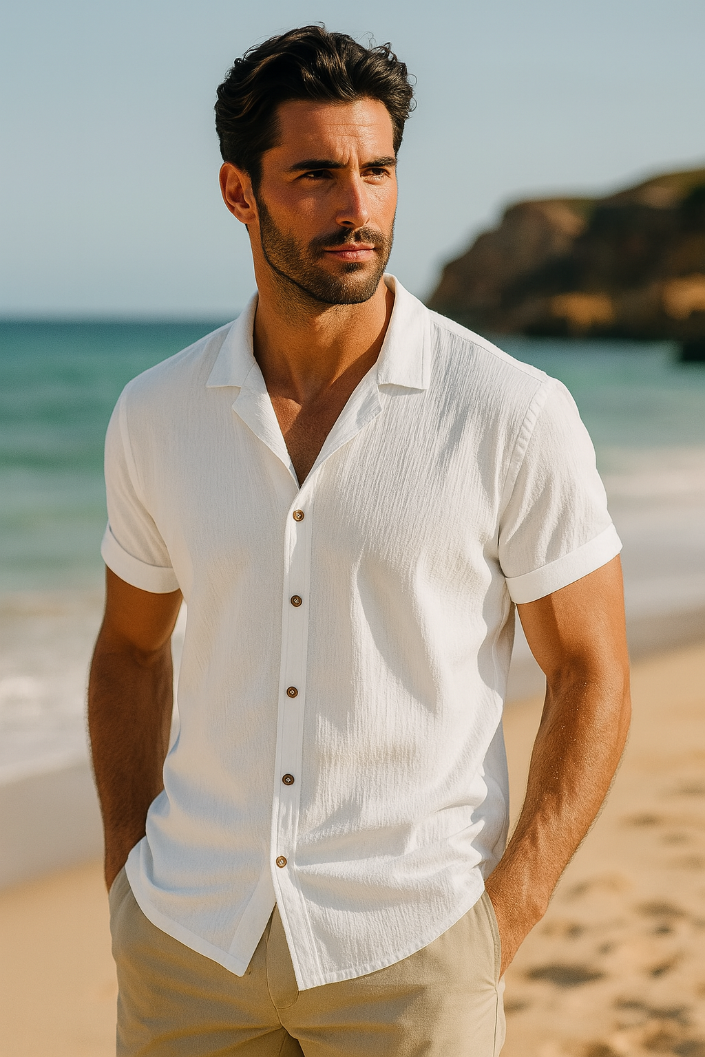 A perfect blend of modern ease and classic refinement, this mandarin-collar shirt exudes quiet sophistication. Its breathable fabric and relaxed silhouette make it an essential for warm-weather styling, whether layered under a blazer or worn solo for a polished off-duty look. Rolled sleeves and subtle texture add depth, making it a go-to for understated elegance.