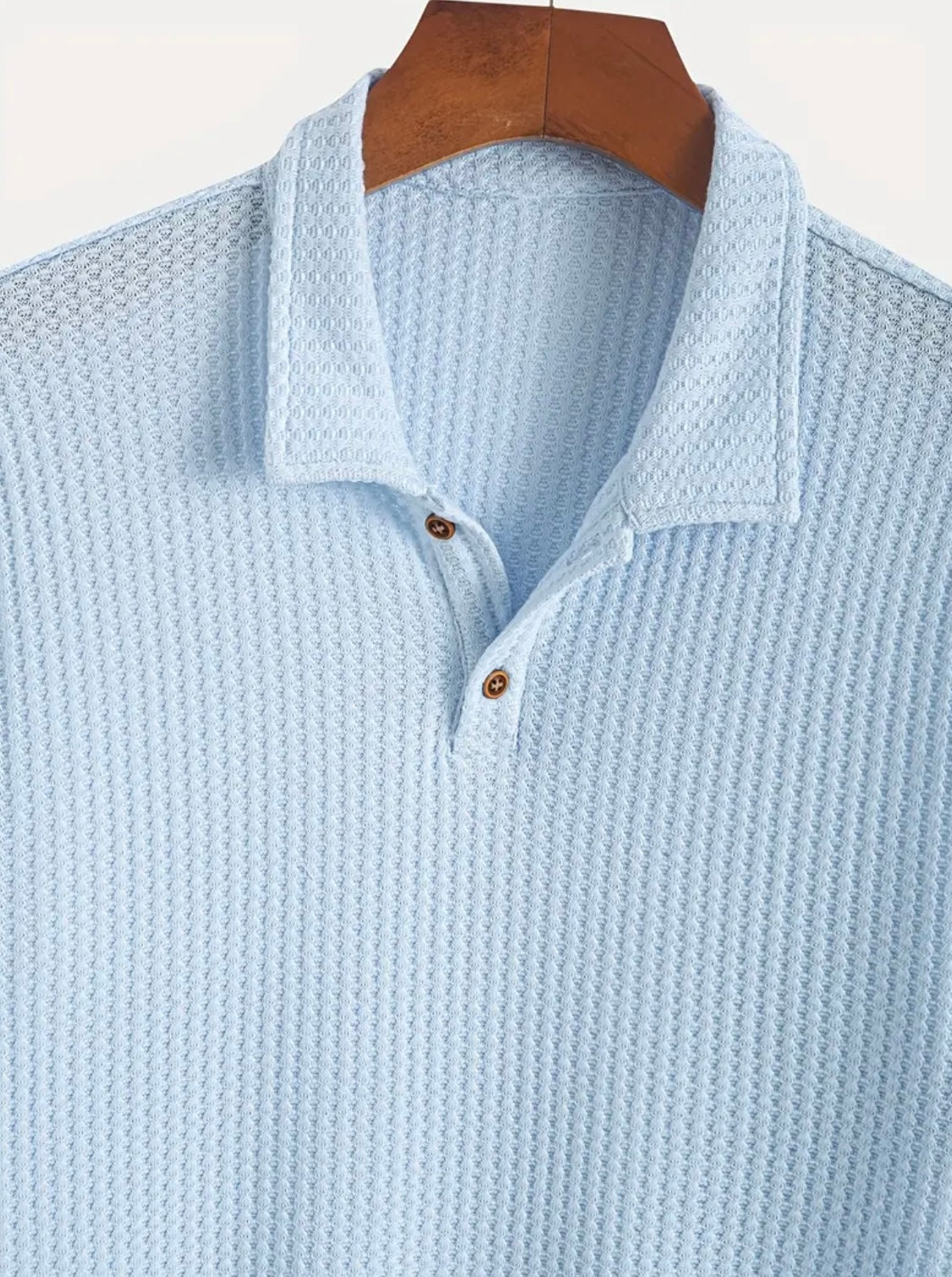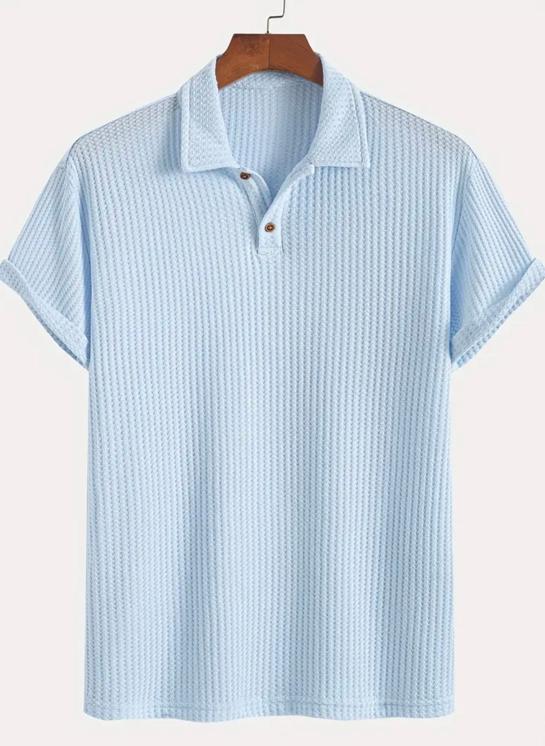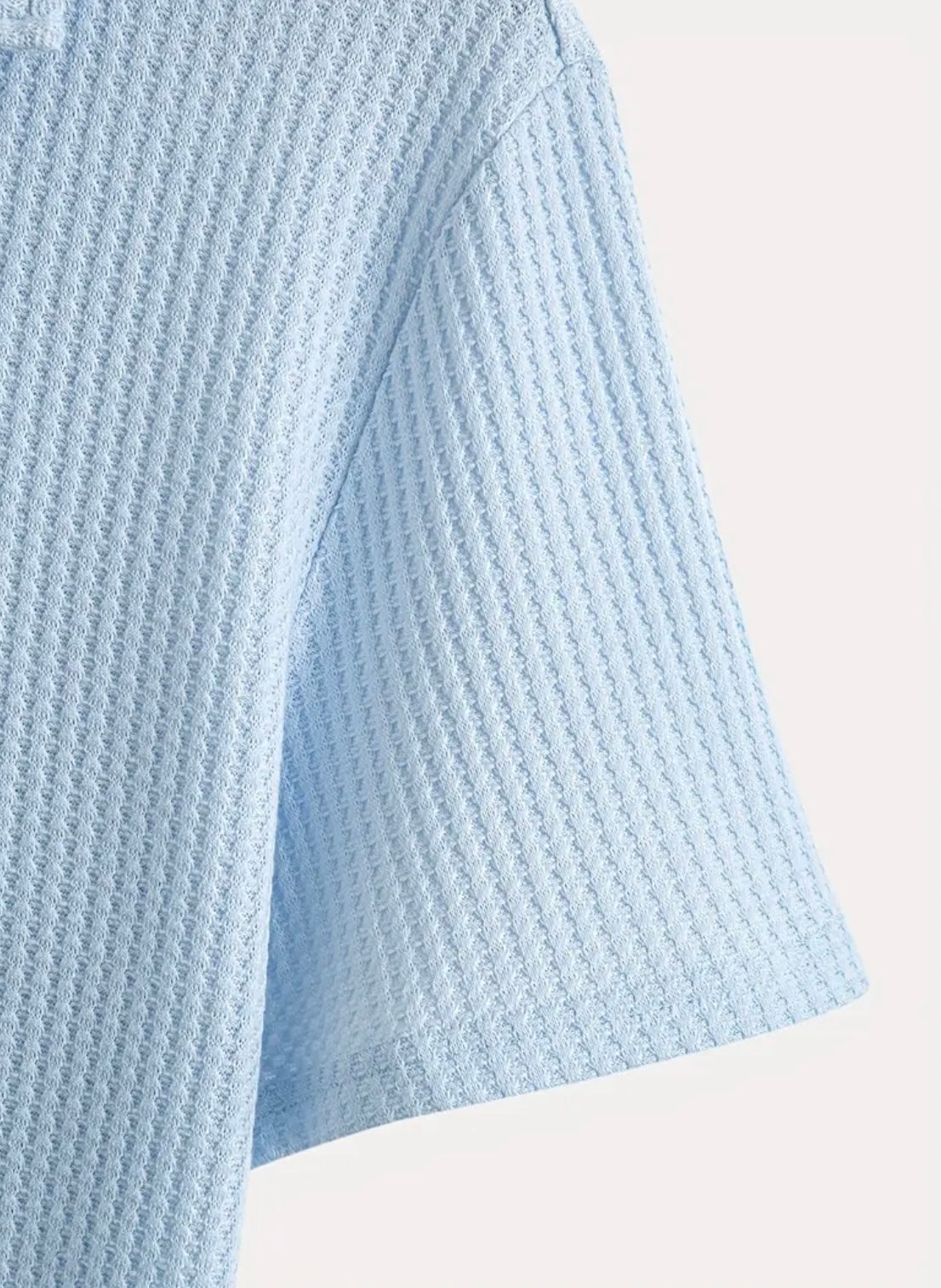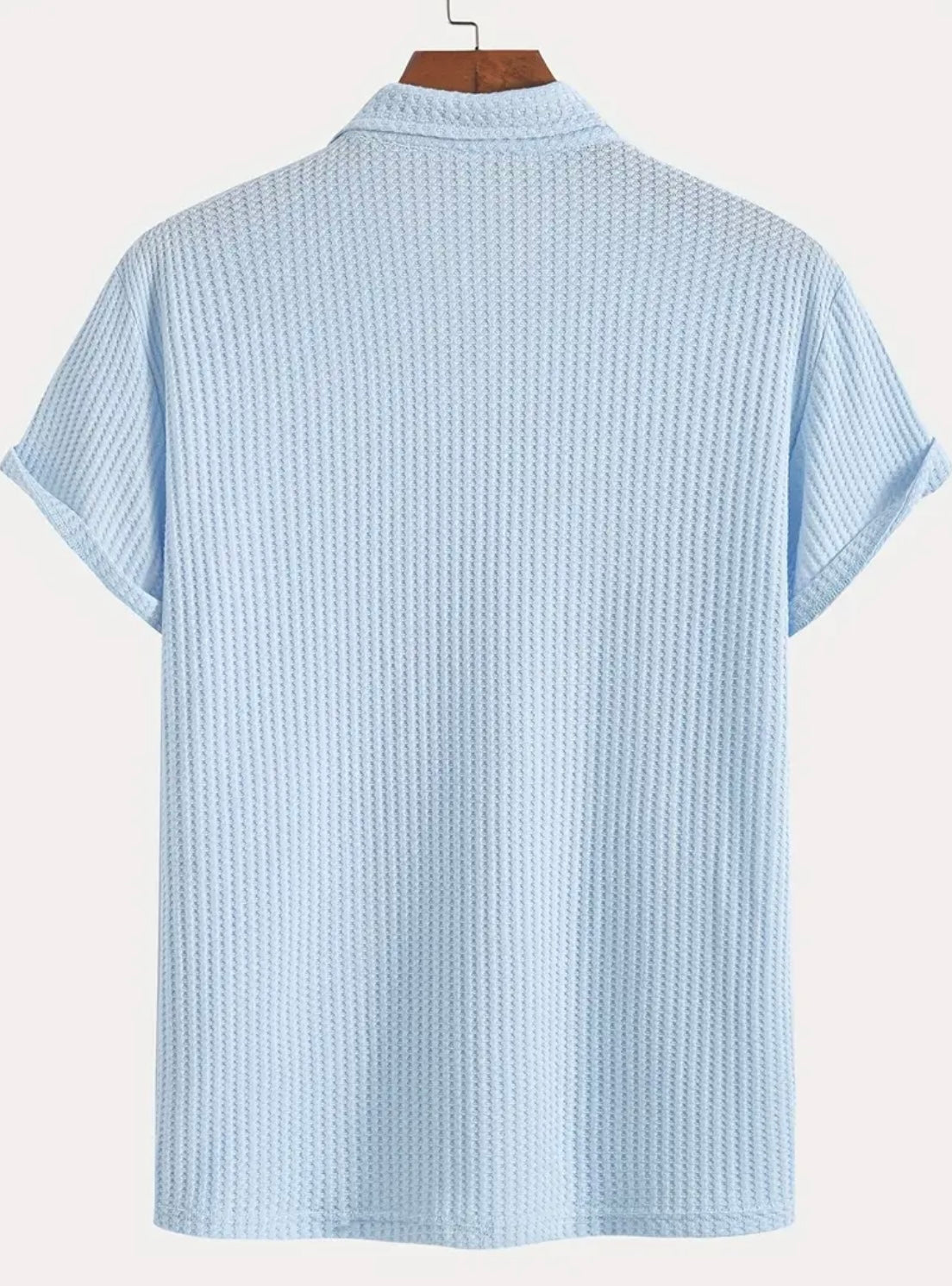 Elevate your summer style with this light blue Men’s Casual Short Sleeve Shirt, crafted from breathable knit fabric with a subtle grid pattern that keeps one cool and sharp all day. Its classic collar and button detail bring a refined touch, making it perfect for golf mornings, office afternoons, and leisure evenings. This regular fit piece delivers effortless elegance and comfort, ensuring a look that feels as good as it appears.