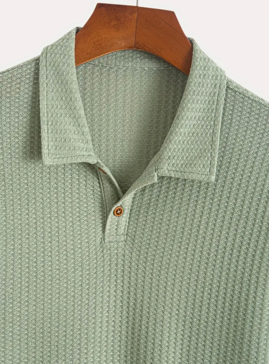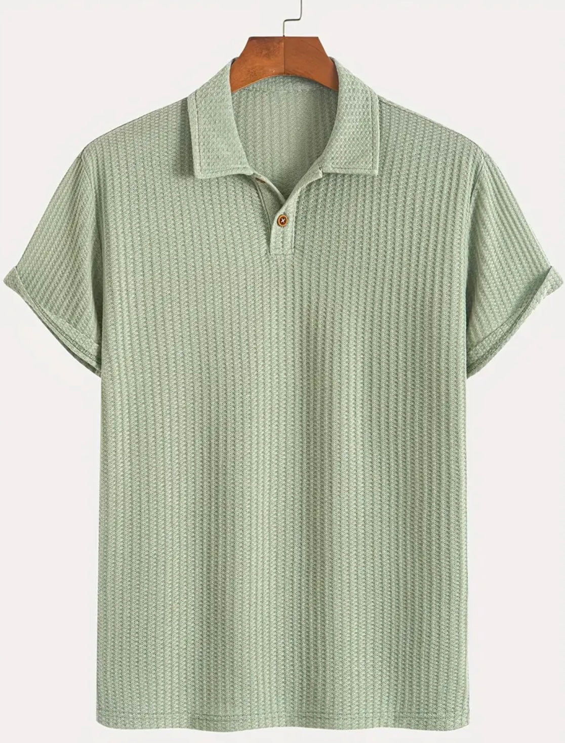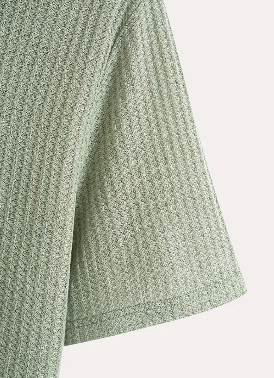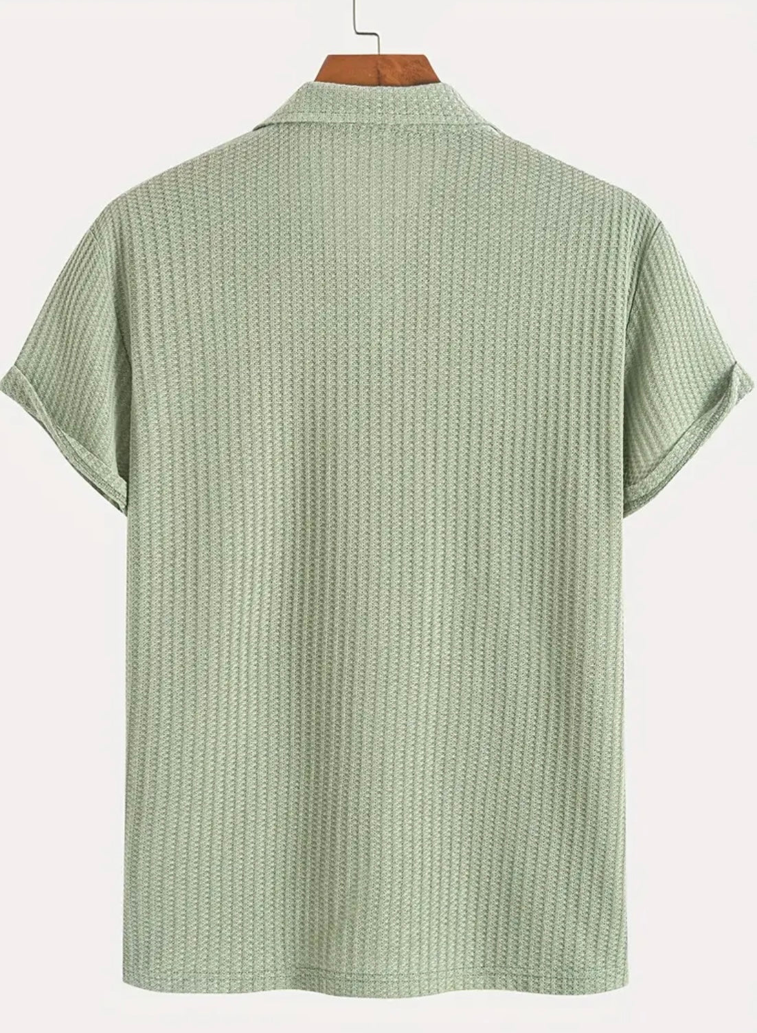 Elevate your summer style with this olive green Men’s Casual Short Sleeve Shirt, crafted from breathable knit fabric with a subtle grid pattern that keeps one cool and sharp all day. Its classic collar and button detail bring a refined touch, making it perfect for golf mornings, office afternoons, and leisure evenings. This regular fit piece delivers effortless elegance and comfort, ensuring a look that feels as good as it appears.
