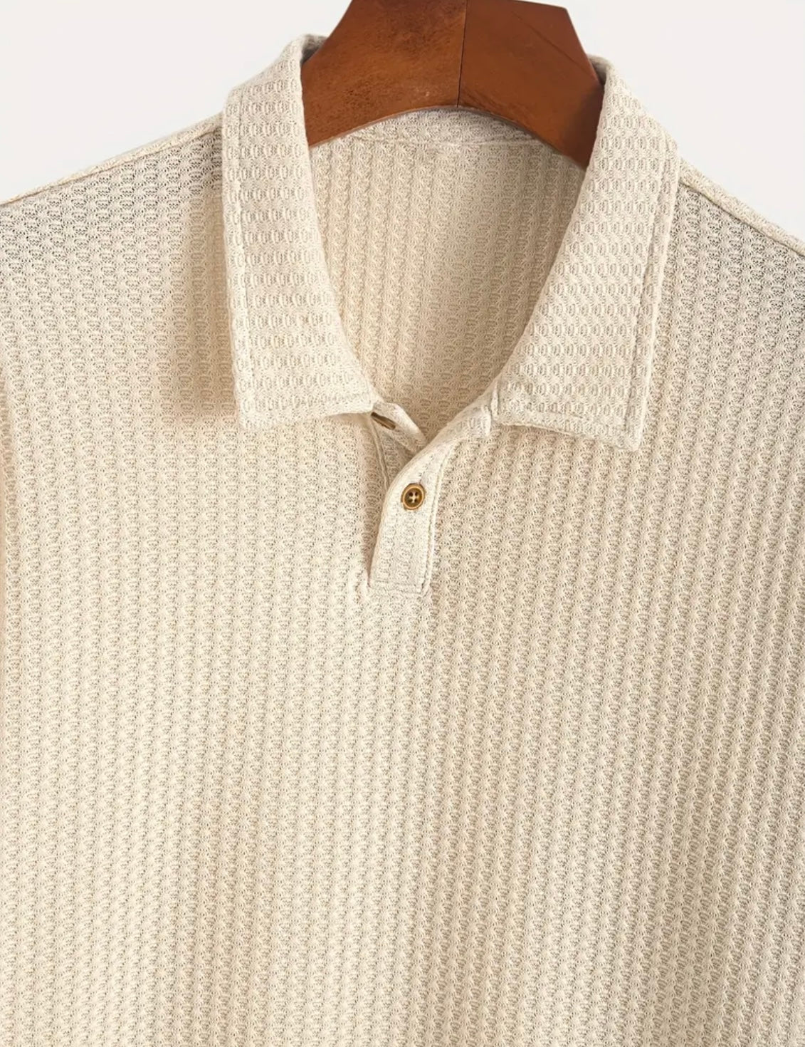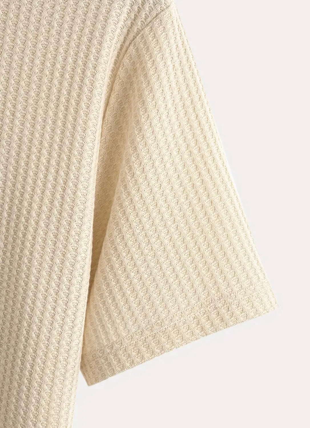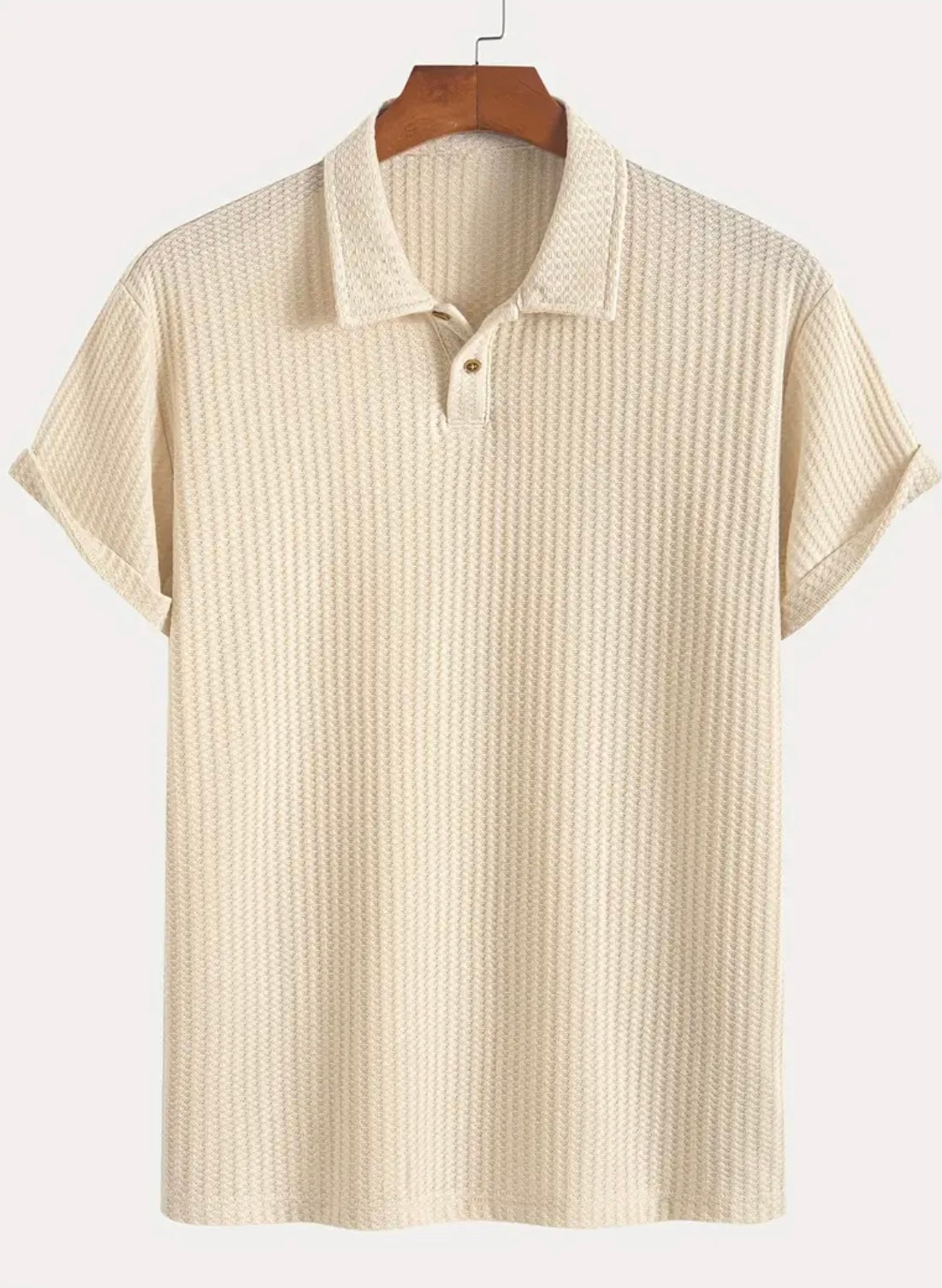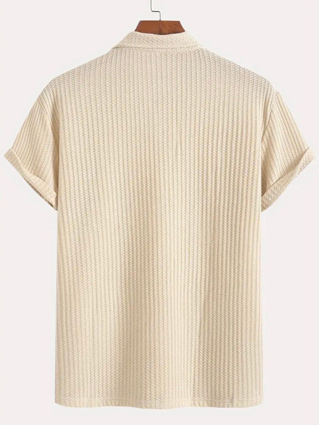 Elevate your summer style with this beige Men’s Casual Short Sleeve Shirt, crafted from breathable knit fabric with a subtle grid pattern that keeps one cool and sharp all day. Its classic collar and button detail bring a refined touch, making it perfect for golf mornings, office afternoons, and leisure evenings. This regular fit piece delivers effortless elegance and comfort, ensuring a look that feels as good as it appears.
